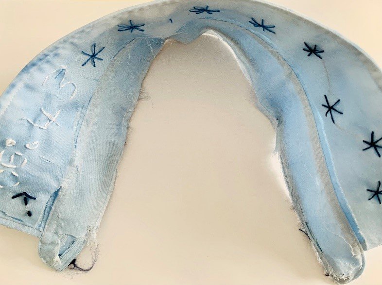 I have deliberately frayed this collar more, emphasising the elements that the collar is made up of. Then using a variation on Running stitch I embroidered the digital time and Star stitched around the inside of the collar too. The stars represent the fact my husband has just been promoted at work- he’s a rising star and they also look like flowers, as this is part of my routine every day - to tend to the garden.
